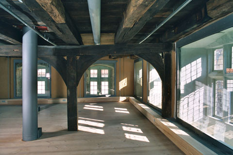| 2. Speicherstock mit bauzeitlicher Holzkonstruktion und Hinzufügungen für die Nutzung als Museum: Lichtschutz, Klimastabilität, Brandschutz (Aufnahme 2004, Gerhard Wellmer) |