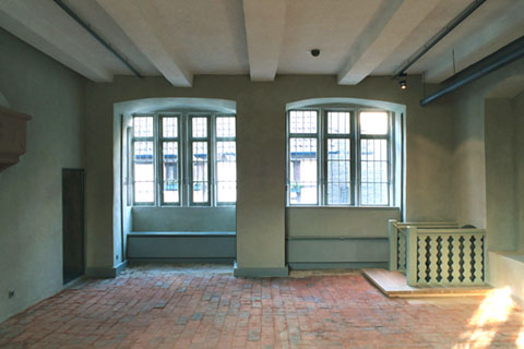 8. Saal, am Kamin datiert 1568, Fenstergewände und Backsteinfußboden bauzeitlich (Aufnahme 2004, Gerhard Wellmer)