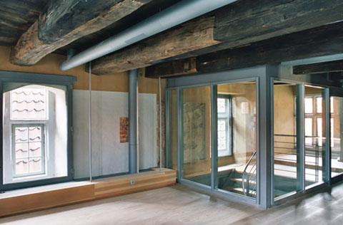 11. Speicherstock mit bauzeitlicher Holzkonstruktion und Hinzufügungen für die Nutzung als Museum: Lichtschutz, Klimastabilität, Brandschutz. Hier die Abtrennung des Treppenhauses als Brandabschnitt (Aufnahme 2004, Gerhard Wellmer)