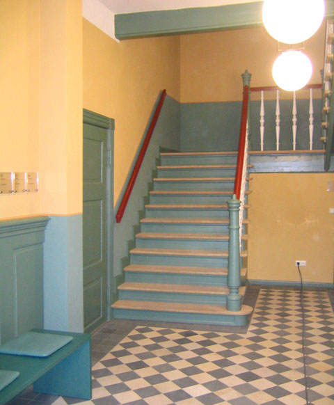 9. Rathaus Malchow, Erdgeschoss, Diele mit der Treppe von 1893, Farbgebung nach Befund um 1920 (Aufnahme 2005)