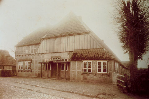 | 3.a. Vergleichsbeispiel, Hohenfelde, Dorfstraße 54/56/58, abgebrochen 1907: Bis zu einem weiteren Anbau auf der Westseite 1779 ähnelte das Alte Pastorat in Stellau dem Bauernhaus in Hohenfelde mit Utlucht auf der Westseite und zweigeschossigem Sommerhaus mit Saal auf der Ostseite (Aufnahme zwischen 1900 und 1907) |