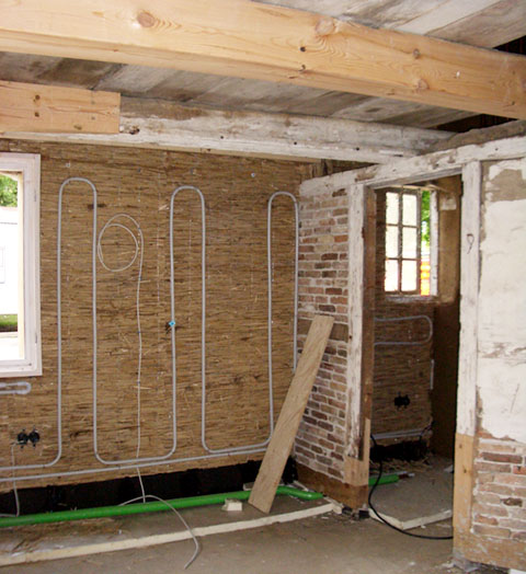9. Stellau, Altes Pastorat: Wandtemperierung innerhalb der inneren Aufdoppelung der Außenwände (Aufnahme 2005)